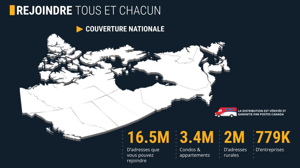 - Distribution par Postes Canada avec ciblage géographique avancé : code postal, ville, secteur ou rayon autour de votre commerce.